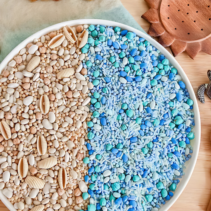 This sensory base is coloured using natural food colourings and non toxic paint. It contains small parts and children should be supervised while using this activity. Perfect for children 3+.