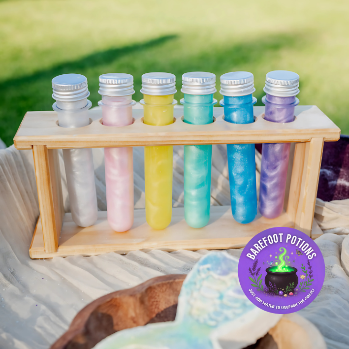 Bring curiosity and fun to your playroom or mud kitchen with this large Test Tubes & Rack set. Handmade from repurposed wood and finished with food-safe wax, each rack is unique with natural wood grain and color variations. The six durable plastic test tubes invite endless experiments in science, potions, and seed germination, sparking imaginative play and discovery every time. Perfect for little explorers ready to dive into hands-on learning and creative adventures.